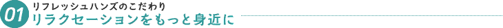 リフレッシュハンズでは、一人ひとり全てのお客様の笑顔のために、徹底した「極上のおもてなし」を大切にしています。ご希望に合わせたスタッフ指名制度もあり、まるでお客様の第二の家のように、心からお寛ぎいただけます。